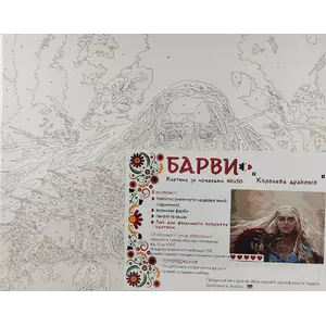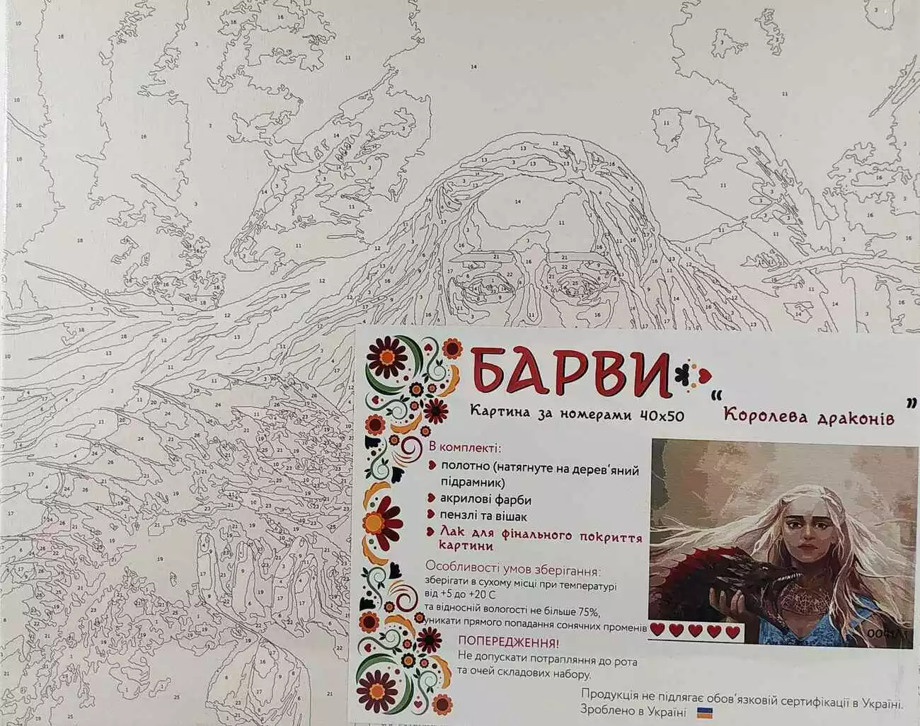 Відчуй себе справжнім художником! Використовуй розпис по номерам і твори шедеври! Дана картина добре прикрасить будь-який інтер'єр і подарує кожному твоєму гостю відчуття перебування вдома у справжнього генія! Увага! Кольори і чіткість картини можуть відрізнятися. Комплектація Набору для малювання: - натягнутий на дерев'яну рамку прогрунтоване полотно, з нанесеними і пронумерованими контурами квітів малюнка. Полотно і весь набір запаяний в стрейч плівку; - настінні кріплення 2 шт. і саморізи; - пронумеровані акрилові фарби в щільно закритих контейнерах (від 14 до 36 кольорів); - кисті (від 3 до 4 шт).