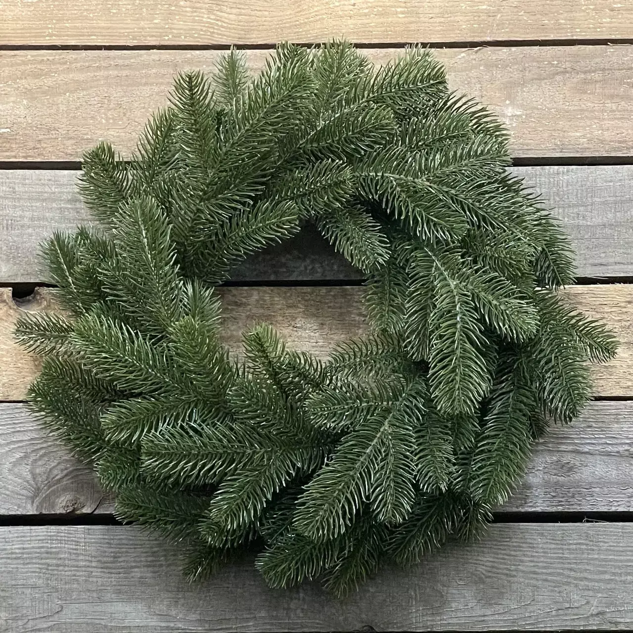 Новорічний декоративний вінок діаметром 40 см являє собою переплетені гілки штучної ялинки. Виготовлений з 100% литої хвої. Голочки як у живої ялинки, але м'які і не колючі. Без декору. Існує старовинне повір'я - новорічний різдвяний вінок обов'язково повинен бути в будинку на Різдво. Він є оберегом, охороняє будинок, притягаючи в нього радість, благополуччя, мир. Напередодні зимових свят дизайнери пропонують різноманітні ідеї для створення святкового інтер'єру для зустрічі Різдва і Нового року. Найпоширеніший варіант - прикрашання вхідних дверей. Повісьте хвойний вінок на міжкімнатні двері у вітальню або спальню. Ви можете купити будь-який новорічний ялиновий вінок і просто повісити його з зовнішнього боку дверей. Або проявити фантазію і прикрасити додавши на свій смак банти, дзвіночки, кульки або дерев'яні підвіски, сніжинки або кілька гілок ягід. Або прикрасити декількома дольками декоративного апельсина, паличками кориці, шишечками. Варіантів може бути безліч, придумуйте різдвяну композицію разом з дітьми, вони теж захочуть проявити фантазію. Внизу двері можна поставити світиться ліхтарик або вази з хвойними гілками. Завершує загальний вигляд хвойна гірлянда в тому ж стилі, оформлена в тих самих тонах. Використайте традиційний європейський варіант - покладіть новорічний вінок на стіл. Навколо нього поставте кілька свічок, додайте різнокольорових кульок, іскристих сніжинок, нитки намистин, фігурку Санта-Клауса чи гномика. Гарно сервіруйте святковий стіл для зустрічі Нового Року або Різдвяного обіду. Мрійте, творіть, і ваші ідеї наповнять будинок радістю, чарами, трохи магією!