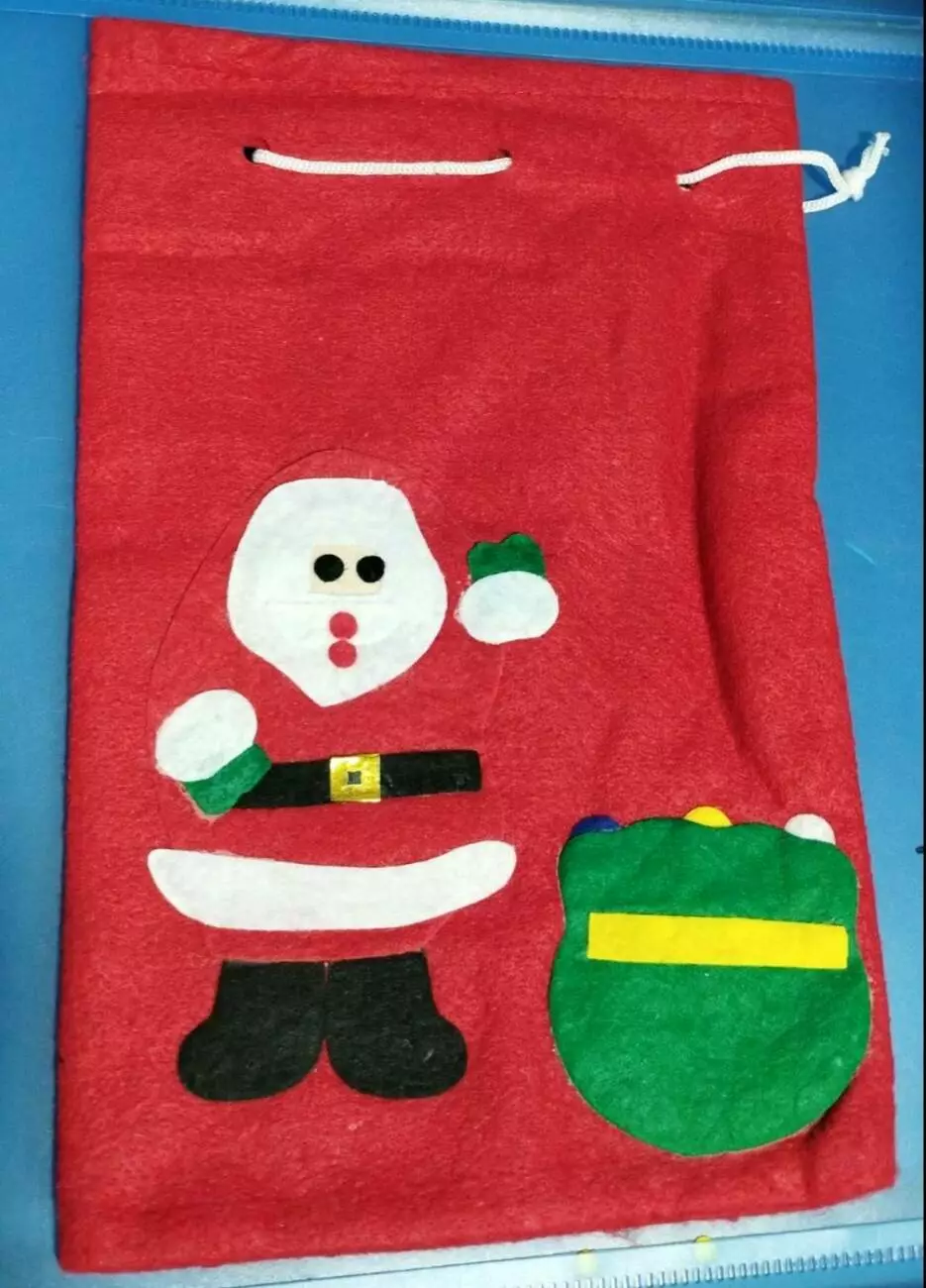 Мішок виготовлений з червоної тканини і прикрашений новорічної картинкою з одного боку. В упаковці різні види картинок на мішках.