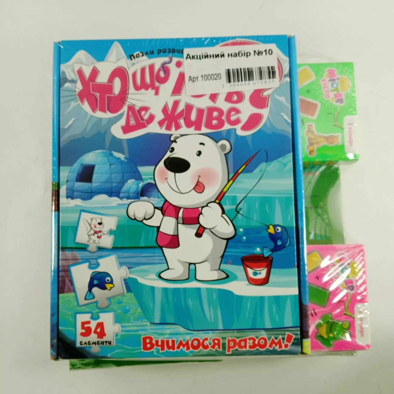 В набір входить : Пазли 30910 (укр) "Хто що їсть? Де живе?" 1шт. , Набір для творчості 71730 (укр) "Містер тісто - жирафа" 1шт. , Набір для творчості 71731 (укр) "Містер тісто - жаба" 1шт. , Набір для творчості "Toy clock - Заяча галявина" (укр.), 15 1шт..