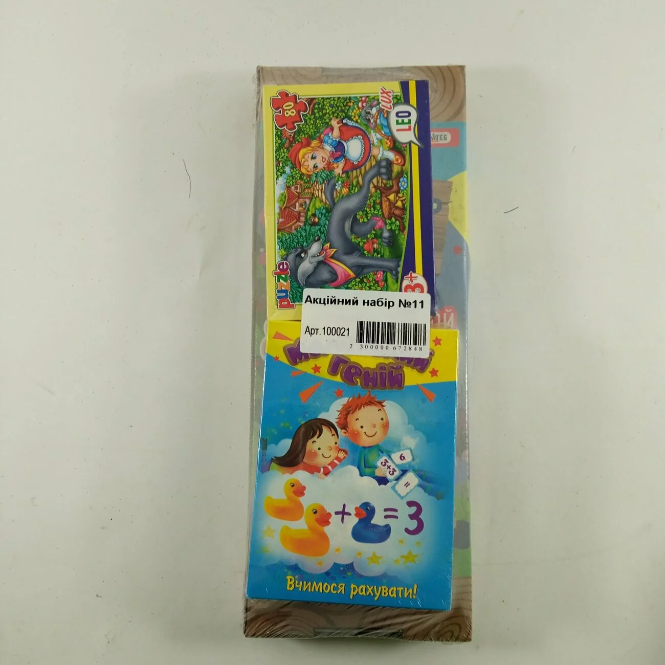 В набір входить : Пазли 80 ел., LEO LUX "Улюблені казки", 1шт. , Навчальні картки 30660 (укр) "Маленький геній", в кор-ці 14-10-2,7 см 1шт. , Набір Еко-розмальовка Квіточка 5003 1шт.
