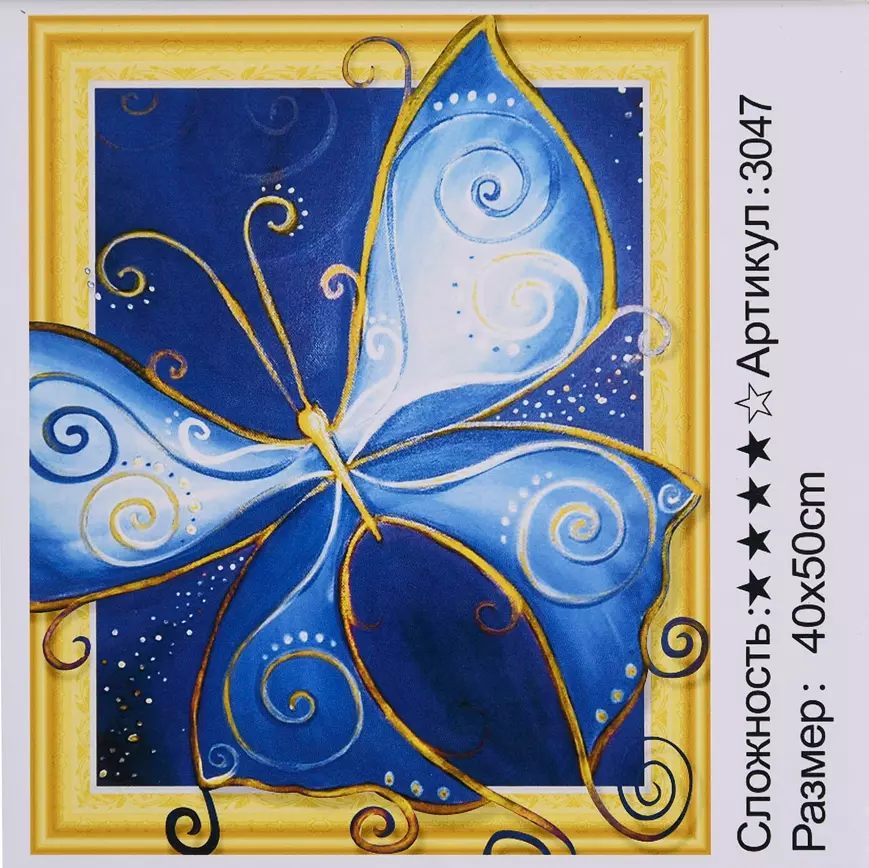 Тип картини – метелики; Складність – 4; Матеріал полотна – ДСП; Розмір полотна – 40х50см; Форма алмазу – кругла; Упаковка – коробка. Комплектація набору: - полотно на підрамнику; - стрази всіх кольорів, необхідних для викладання картини (кожен колір в окремому, пронумерованому пакетику); - 3 зіп-пакета; - пластиковий піддон для алмазів; - таблиця відповідності кольорів і позначень алмазів; - спеціальна ручка для роботи з алмазами; - відбиток.