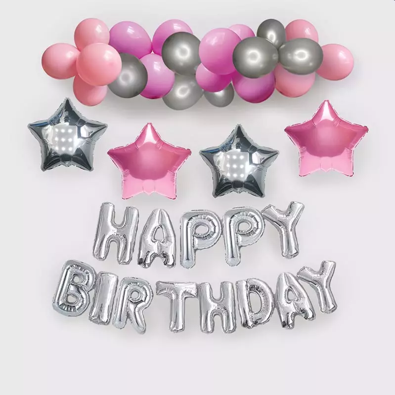 Арка-гірлянда з повітряних куль з написом "Happy Birthday" рожева зі сріблом