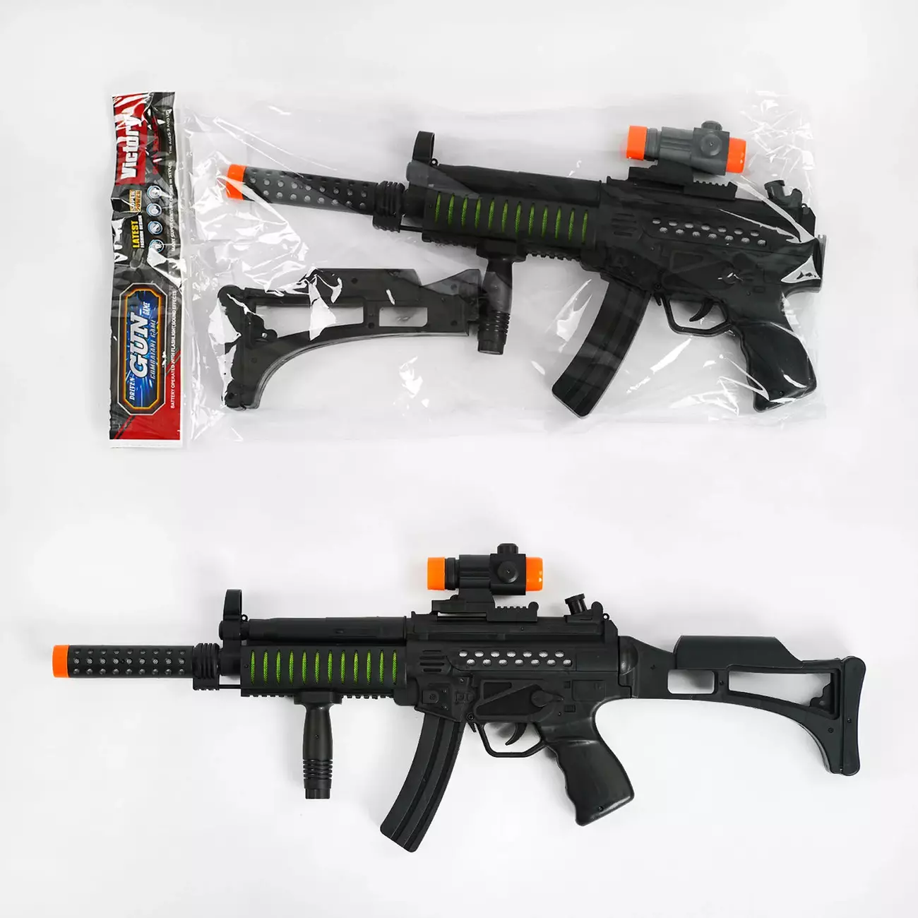 Космічний автомат 578 стане повсякденною іграшкою міжгалактичного воїна, сучасного правоохоронця або бравого героя нашої планети! Зброя виконана у класичному чорному кольорі, який доповнений яскравими вставками та вилитими елементами декору. Особливості: - космічні звуки пострілів; - мерехтливе різнокольорове підсвічування корпусу; - чудова деталізація ігрової моделі; - довжина: 62 см; - іграшка виготовлена з якісного та зносостійкого пластику, здатного витримувати активну експлуатацію; - автомат працює від 3х батарейок типу "АА" (у комплект не входять).