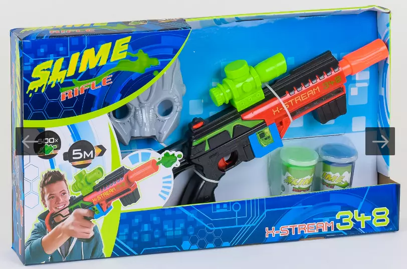 Автомат СН 348 стане чудовим подарунком для хлопчиків. Особливістю даного автомата стало те, що він стріляє не звичайна кульками на присосках або водними кулями, а Лизун! Заливаємо Лизуна в спеціальний відсік і в бій! Дальність пострілу близько 5 м. Набір додатково комплектується маскою, мішенню і двома резервуарами з слайм (приблизно 500 пострілів).