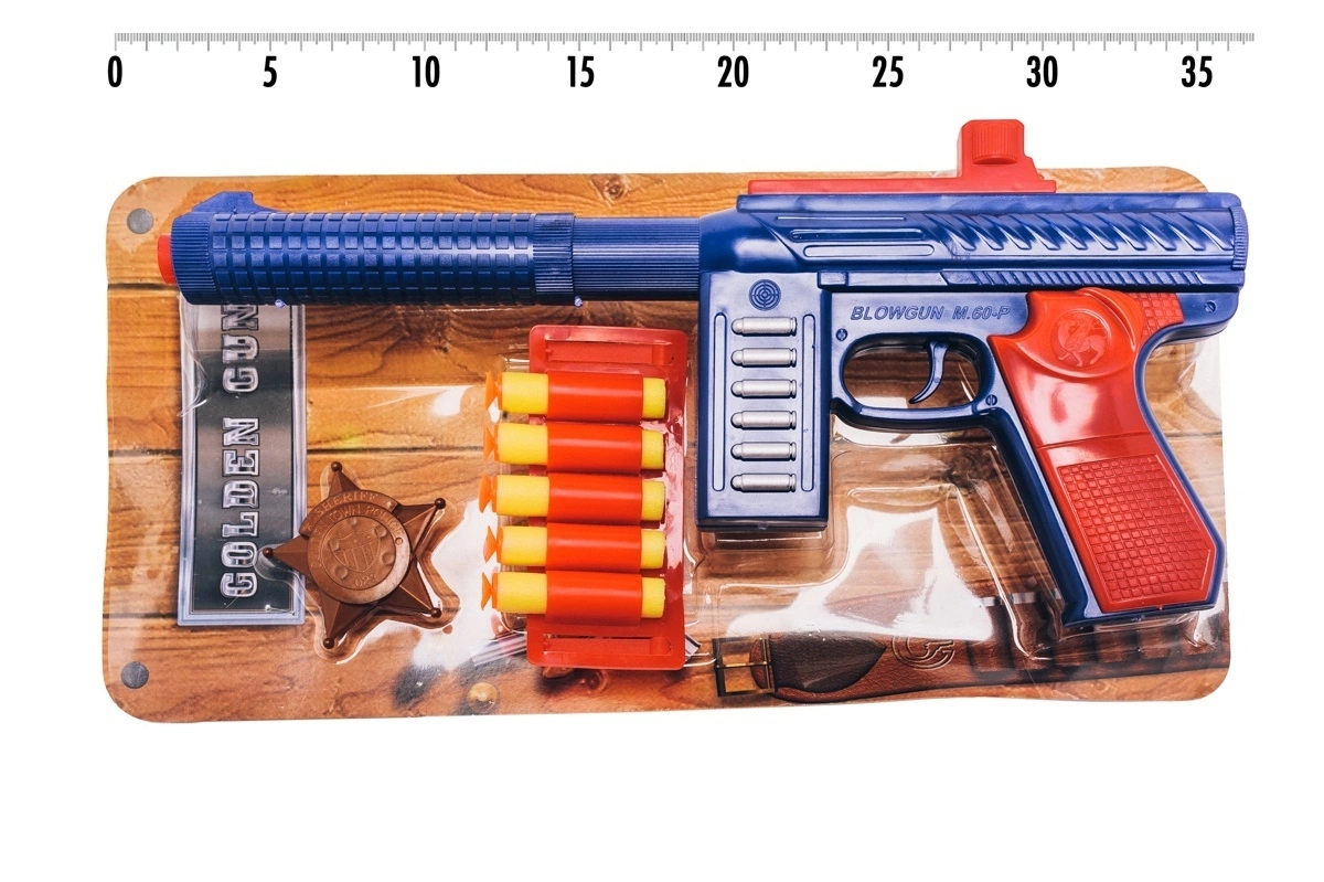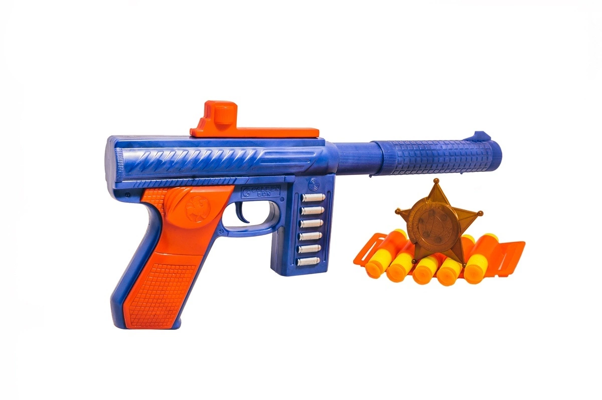"М60 ПФ" автомат стріляє м'якими поролоновими кулями на присосках. Довжина - 34 см Висота - 16,5 см. Комплект: автомат, чотири м'яких поролонових кулі на присосках закріплених на стрічці, значок нагрудний. Упаковка: поліпропіленова на картонній основі. Вага: 227 грам. Артикул: 909 В ящику: 30шт.