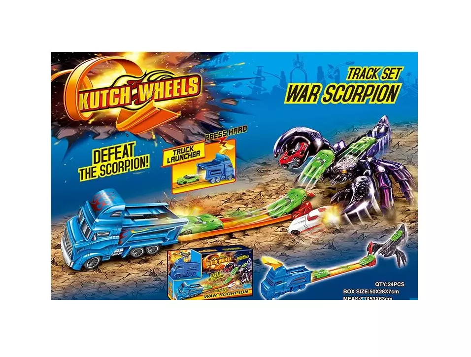Збери свій власний автотрек і влаштовуй справжні гонки! Особливістю треку є пусковий механізм у вигляді вантажівки. Трек складається з прямої траси і фінішем у вигляді величезного скорпіона. Трек стане улюбленою іграшкою юного гонщика і буде радувати його широким діапазоном ігрових можливостей У наборі: деталі треку, машинка, інструкція.