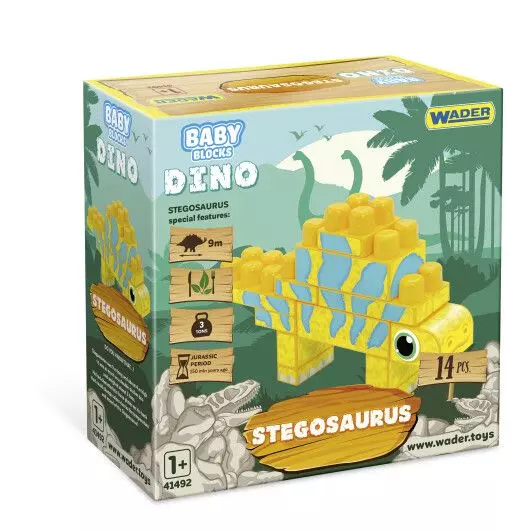 Кубики Baby Blocks – це чудовий варіант першого конструктора для малюка. Різноманітні кольори і форми, відповідний і безпечний розмір, що підійде найменшим діткам, а також дуже легка система кріплення зроблять знайомство з конструктором простим і цікавим. З допомогою Baby Blocks Dino діти складуть свого першого динозавра. Baby Blocks стегозавр - конструктор, який складається з 14 кольорових елементів, його тіло захищала броня з величезними пластинами! Ігри конструктором Baby Blocks фірми Wader розвиває уяву і креативність дітей, їх мануальні здібності, точність рухів і зорово-рухову координацію. Кольорові елементи допоможуть у вивчені основних кольорів, а також їх можна застосувати для перших уроків лічби. Крім будування, цікавим заняттям для малюка може бути сортування кубиків за кольором чи формою, вкидання і виймання їх з/до коробки. На коробці знаходиться цікава інформація про динозварика, якого складатиме ваша дитина, що допоможе ще більше дізнатись про нього. Всі елементи виготовлені з високоякісних сертифікованих безпечних матеріалів. в набір входять наклейки, а також інструкція для складення дуже легка система монтажу виготовлений з високоякісних безпечних сертифікованих матеріалів для дітей від 1 року.