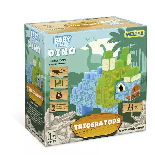 Кубики Baby Blocks – це чудовий варіант першого конструктора для малюка. Різноманітні кольори і форми, відповідний і безпечний розмір, що підійде найменшим діткам, а також дуже легка система кріплення зроблять знайомство з конструктором простим і цікавим. З допомогою Baby Blocks Dino діти складуть свого першого динозавра. Baby Blocks трицератопс - конструктор, який складається із 23 кольорових елементів, що дозволяють збудувати двокольорового динозавра: його справжній відповідник досягав довжини аж 8 метрів! . Ігри конструктором Baby Blocks фірми Wader розвиває уяву і креативність дітей, їх мануальні здібності, точність рухів і зорово-рухову координацію. Кольорові елементи допоможуть у вивчені основних кольорів, а також їх можна застосувати для перших уроків лічби. Крім будування, цікавим заняттям для малюка може бути сортування кубиків за кольором чи формою, вкидання і виймання їх з/до коробки. На коробці знаходиться цікава інформація про динозварика, якого складатиме ваша дитина, що допоможе ще більше дізнатись про нього. Всі елементи виготовлені з високоякісних сертифікованих безпечних матеріалів. в набір входять наклейки, а також інструкція для складення дуже легка система монтажу виготовлений з високоякісних безпечних сертифікованих матеріалів для дітей від 1 року.