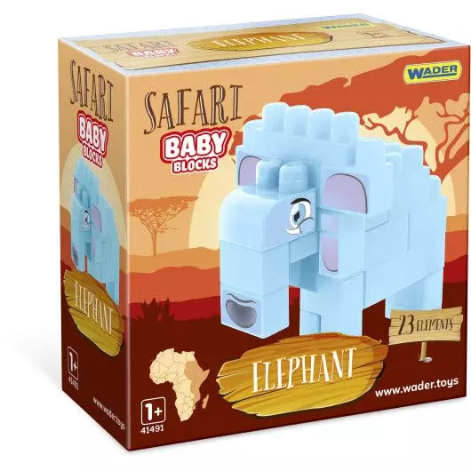 Кубики Baby Blocks – це чудовий варіант першого конструктора для малюка. Різноманітні кольори і форми, відповідний і безпечний розмір, що підійде найменшим діткам, а також дуже легка система кріплення зроблять знайомство з конструктором простим і цікавим. За допомогою конструктора Baby Blocks Сафарі діти можуть скласти своїх перших тваринок. У наборі Baby Blocks слон - 23 кольорових кубика, які дозволять збудувати фігурку слона. Різноманітність елементів створюють необмежені можливості для гри – їх можна не тільки складати, але й також вигадувати дивовижні історії з їхньою участю. Кожен набір можна використовувати окремо, або зібрати цілу колекцію і поринути у фантастичну пригоду. Ігри конструктором Baby Blocks фірми Wader розвивають уяву і креативність дітей, їх мануальні здібності, точність рухів і зорово-рухову координацію. Кольорові елементи допоможуть у вивчені основних кольорів, а також їх можна застосувати для перших уроків лічби. Крім будування, цікавим заняттям для малюка може бути сортування кубиків за кольором чи формою, вкидання і виймання їх з/до коробки. Всі елементи виготовлені з високоякісних сертифікованих безпечних матеріалів. в набір входять наклейки, а також інструкція для складання дуже легка система монтажу виготовлений з високоякісних безпечних сертифікованих матеріалів для дітей від 1 року.