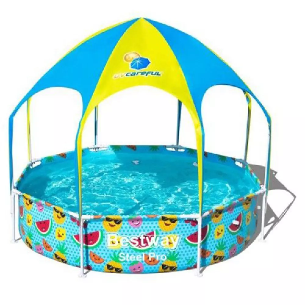 Басейн каркасний з навісом та душем Bestway 56432 подарує радість та веселощі всій вашій родині. Характеристики: Тип: збірний, каркасний басейн Форма: кругла Система складання каркасу: металеві з'єднувачі з пластиковими штифтами. Час монтажу: до 30 хвилин (2-3 особи) Діаметр: 244 см Висота: 51 см Глибина на 8 см нижче - 43 см: захист від переповнення Місткість води, об'єм 90%: 1688 л Кількість стійок: 8 прямих Тип підключення чаші: на хомутах Матеріал чаші: тришаровий ПВХ: ПВХ + скловолоконна сітка + ПВХ Матеріал товщина: стінок – 0.42 мм, дна – 0.25 мм. Матеріал каркасу: Корозійностійкий, металевий каркас (оцинковані сталеві труби з порошковим покриттям як усередині, так і зовні)