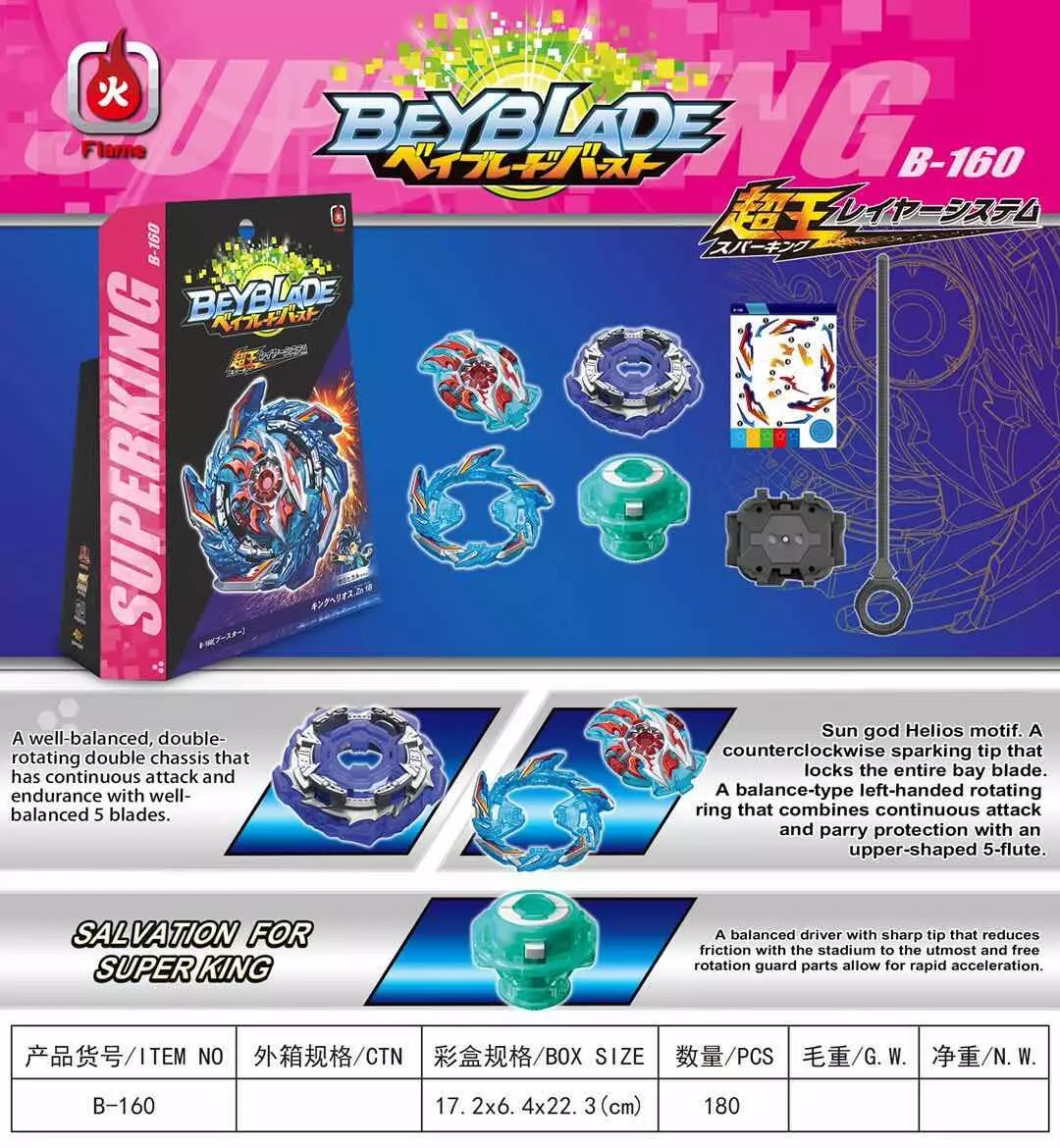 <p><em><strong>Beyblade В-160 Burst King Helios</strong></em> <em><strong>на <strong>sportdriv</strong>e.com.ua</strong></em></p><br /> <p>Владельцем бейблейда Кинг Гелиос будет новый персонаж Hikaru Asahi, который очень напоминает любимчика блейдеров Волта Аоя. Известно, что данный бей будет иметь левостороннее вращение и сражаться в режиме баланс. Для достижения высоких характеристик стабильности, для него разработали специальный новый драйвер Zn. </p><br /> <p>Основные характеристики Кинг Гелиос:</p><br /> <ul><br /> <li>официальное название: Beyblade Burst King Helios Zn 1B;</li><br /> <li>артикул: B-160;</li><br /> <li>тип сражения: баланс;</li><br /> <li>технология: Superking Layer System;</li><br /> <li>чип: Хелиос;</li><br /> <li>энергетический слой: Кинг;</li><br /> <li>силовой диск: 1B;</li><br /> <li>драйвер: Zn.</li><br /> </ul><br /> <p>Анализируя новые волчки 5 сезона, заметили важную особенность, которая заключается в новых модификациях силовых дисков. В бейблейде Кинг Гелиос (Король Хелиос) также новая конструкция - 1B. </p><br />