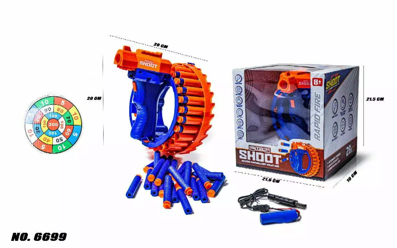 <p>Детское оружие автоматический Бластер пулемет Shoot gun не оставит равнодушным представителей мужского пола всех возрастов! Бластер пулемет представлен в виде рукоятки с патронным барабаном. На рукояти находится 2 кнопки управления: ВКЛ И ВЫКЛ для запуска стрельбы, поэтому пользоваться оружием очень просто.</p><br /> <p>Для начала необходимо вставить до упора 28 патронов в ячейки барабана, включить бластер, снять предохранитель, прицелиться и нажать кнопку пуска! Мультибластер автоматически начинает стрелять со скоростью несколько пуль в секунду. поражая вашу цель на расстоянии до 10 метров! Мягкие пули с присосками безопасные и не наносят ущерба ни здоровью, ни окружающим предметам.</p><br /> <p>За счет съемного аккумулятора бластер обладает большей мощностью и с легкостью крутит барабан в отличии от моделей на батарейках. Время работы 30 минут, время заряда 20- 30 минут.</p><br /> <p><strong>Преимущества:</strong></p><br /> <ul><br /> <li>игра безопасна, подходит для малышей и взрослых</li><br /> <li>безопасные, легкие патроны</li><br /> <li>съемный аккумулятор </li><br /> <li>быстрая зарядка</li><br /> </ul><br /> <p><strong> Комплектация:</strong></p><br /> <ul><br /> <li>бластер (пистолет)</li><br /> <li>28 патронов</li><br /> <li>usb-провод для зарядки</li><br /> <li>аккумулятор</li><br /> <li>мишень</li><br /> </ul><br />