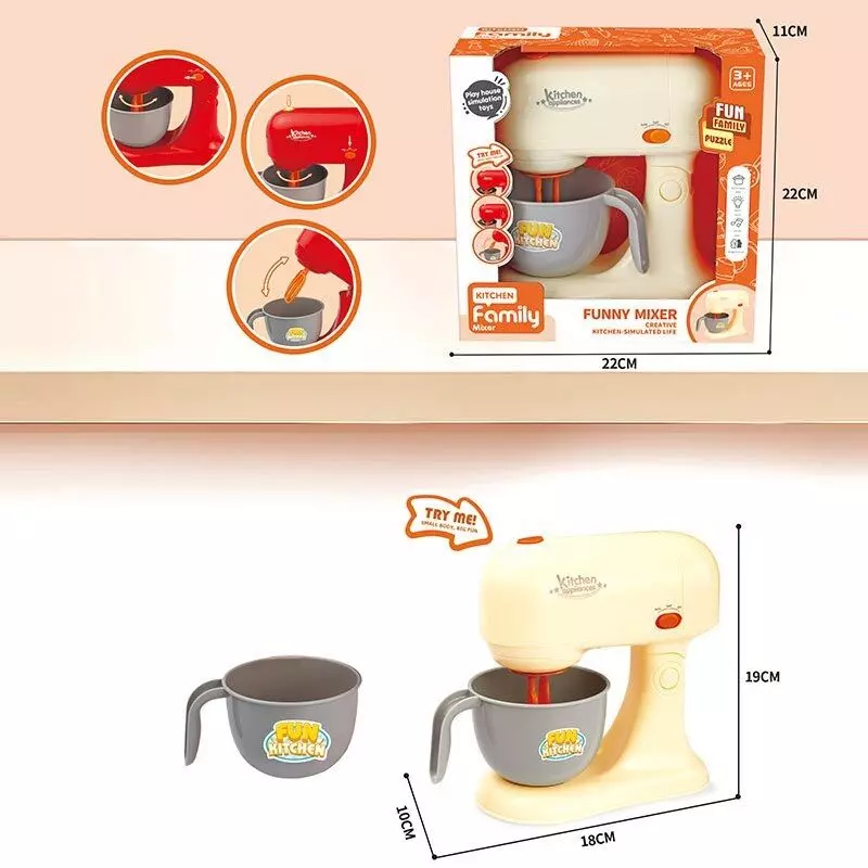 У іграшковій кондитерській дуже зайнятий ранок, на завтра клієнт замовив 100 тортів та 50 кексиків, і тепер пекарі готують всі необхідні заготовки, адже бісквіт для тортів потрібно зробити завчасно. І щоб швиденько збивати білки для коржів потрібен потужний міксер, який пришвидшить роботу, і таким помічником став цей яскравий красунчик! Він має 2 режими збивання — ручне та автоматичне, верх міксера можна легко підняти, або зняти його з основи. З такою іграшкою можна відчути себе справжнім кондитером та створити унікальні ігрові сюжети. Особливості: - милий дизайн; - міксер може працювати у 2 режимах — ручному, коли потрібно затиснути кнопку і тоді насадки почнуть обертатися, а кнопка буде підсвічуватися, та автоматичному; - верх міксера можна підняти або зняти з основи; - іграшка працює від батарейок (додаються); - до міксера додається глибока чаша для збивання; - іграшка виготовлена з якісного пластику, який є безпечним для здоров’я дитини.