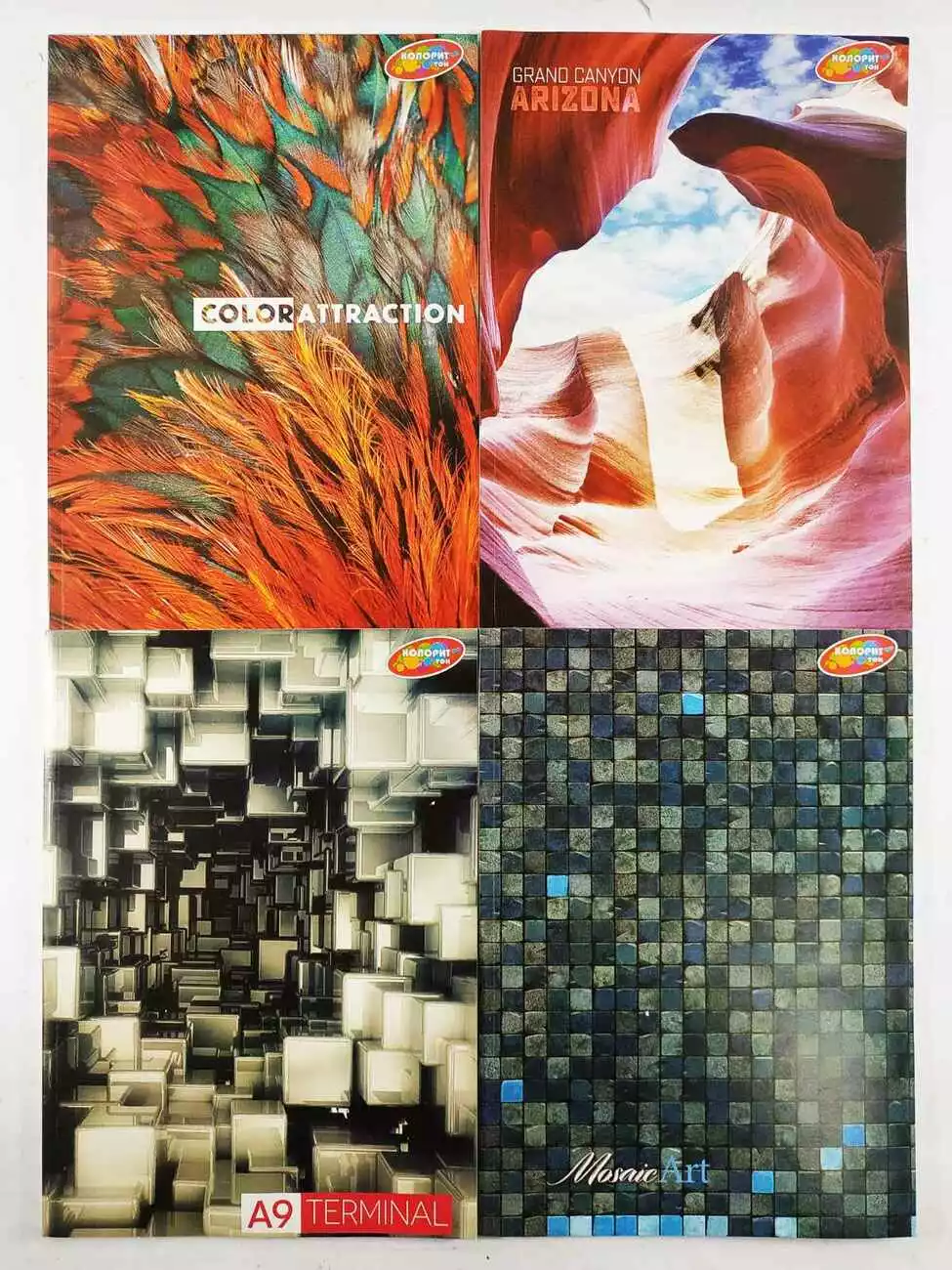 Блокнот представлен в формате А4. Обложка - мелованный картон, полноцветная печать. Блок с офсетной бумаги в клеточку, состоит из 50 листов. Дизайн обложек в ассортименте.