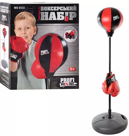 Боксерський набір Profi MS 0333 - потрібний юному спортсменові, що починає тренуватися, його можна встановити, як в приміщенні, так і на відкритому повітрі. У набір входить підпора з регульованою висотою від 90 см до 130 см, боксерська груша і рукавички. Підставка заповнюється піском або іншим наповнювачем для стійкості. Діаметр груші 23 см. Вік Від 5 років Стать дитини Для хлопчиків Матеріал Штучна шкіра Розвиває Концентрацію уваги, фізичний розвиток Розмір упаковки 48 х 41,5 х 13 см Країна виробник Китай У комплекті Груша (23 см), стойка (від 90 до 130 см), рукавички 2 шт.