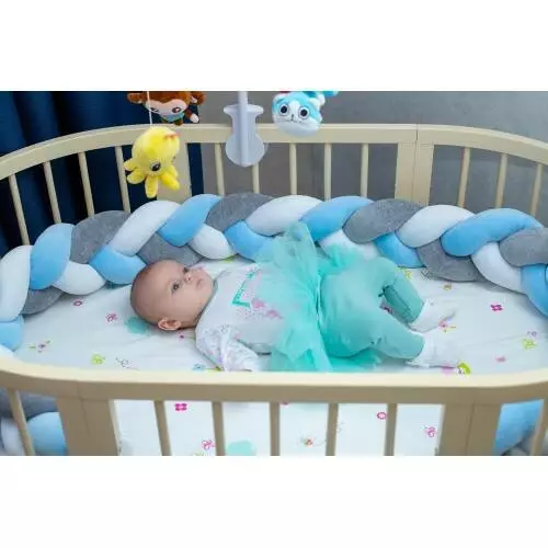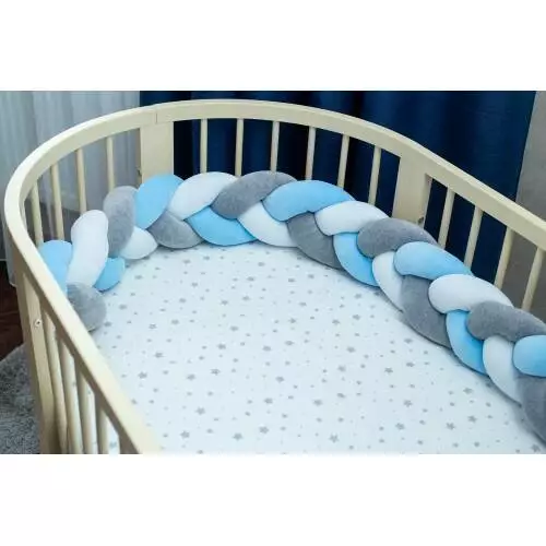 Бортик в кроватку Хатка Косичка Белый-Голубой-Серый 360 см (по всему периметру кроватки)