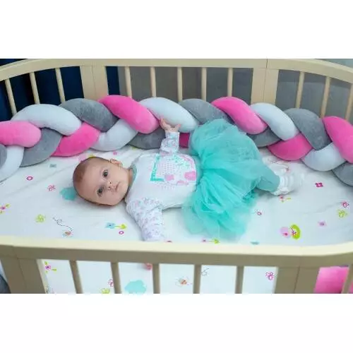 Бортик в кроватку Хатка Косичка Белый-Серый-Розовый 180 см (половина кроватки)