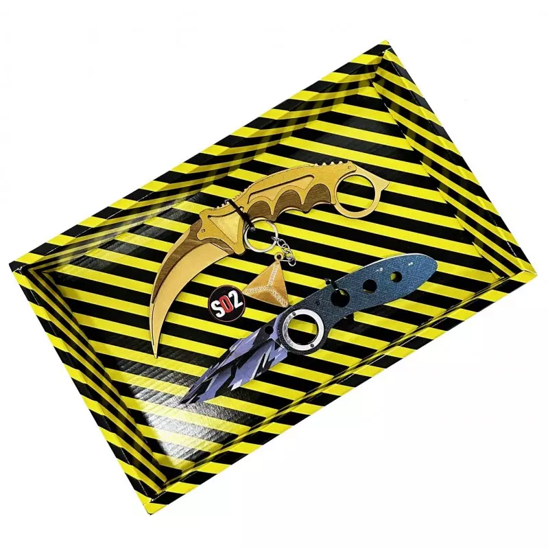 BOX Сувенірний SO-2 "КЕРАМБІТ GOLD & ФЛІП ARCTIC" BOX. Набір сувенірних ножів – ніж керамбіт та фліп. У комплекті також є брелок у подарунок. Матеріал: фанера. Довжина ножа-метелика - 28 см, довжина тичкових ножів - 13 см. Відмінний подарунок-сувенір. Ножі дерев'яні, якісні та міцні. Не заточені, гострі частини закруглені та зашліфовані, повністю безпечні.