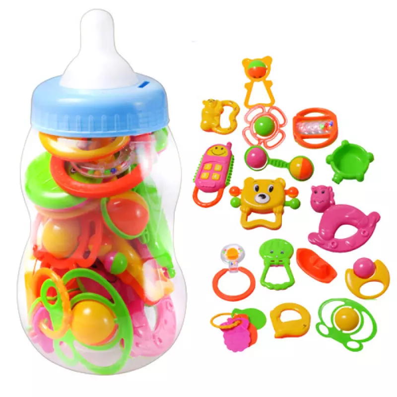 В наборі 16 брязкалець. Упаковка колба у вигляді пляшечки розміром 34 см.