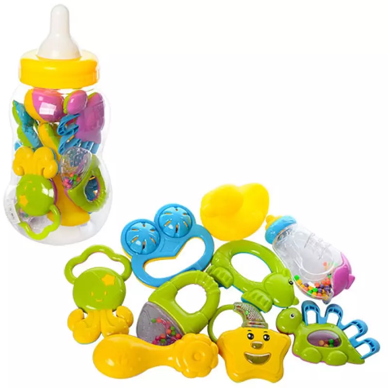 Набір брязкальця безсумнівно приверне увагу будь-якого малюка. Брязкальця перебувають у колбі(30см). У наборі 9 різних брязкальців (від 10см). Брязкальце розвиває сприйняття, дрібну моторику рук та пальців. Іграшка виготовлена із пластику. Підходить для дітей віком від 3 міс. Габарити 14*23*14