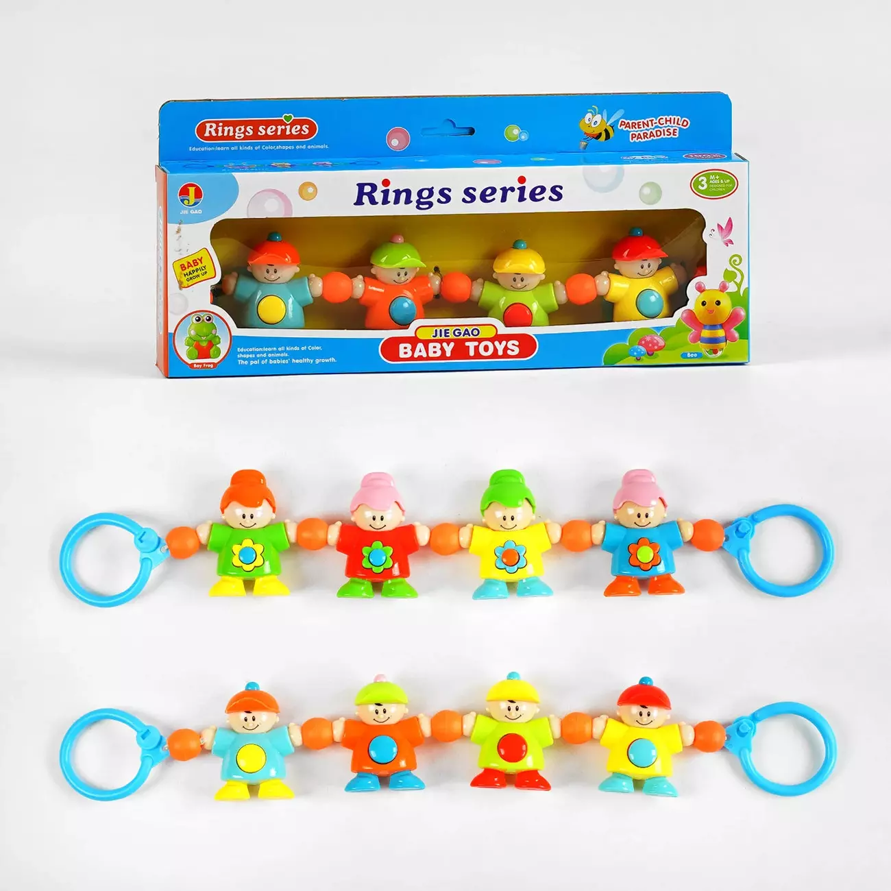 Кольорове підвісне брязкальце для дитячого візочка або ліжка. Виконане у вигляді яскравих малюків, які поєднані між собою еластичною мотузочкою. Іграшка має зручні тримачі та легко кріпиться у ліжечко та візочок. Брязкальце принесе малечі радісні емоції та гарний настрій на прогулянках та вдома. Особливості: - брязкальце складається з 4 різнокольорових елементів, всередині яких приховані елемент, що гримлять; - елементи поєднані резинкою, завдяки чому брязкальце можна розтягувати; - по обидва боки підвіски розташовані зручні тримачі із застібками; - іграшка виготовлена з безпечного для здоров’я дитини пластику; - яскрава колірна гама; - брязкальце сприятиме розвитку уваги, сенсорного, слухового та зорового сприйняття, а також дрібної моторики.