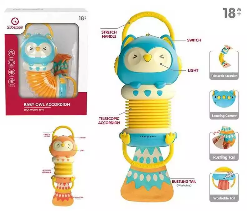 Брязкальце YL 616 A (24) 3 кольори, ""Сова"", підсвічування, мелодії, англ.алфавіт, пісні англійською, телескопічний акордеон, у коробці, МІКС ВИДІВ