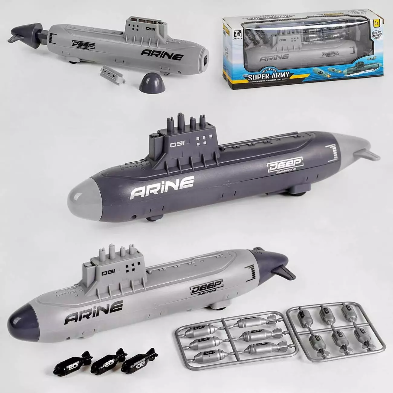 Серія іграшок “Super Army” припаде до смаку маленьким поціновувачам військової техніки. Швидкісний підводний човен T 073 стане перлиною мілітарі колекції вашого малюка. Іграшка-запускник оснащена великою кількістю боєголовок, що наводить у дію спеціальний запускний механізм, розташований у хвостовій частині підводної лодки. Особливості: - відповідає технічному регламенту безпеки іграшок; - представлена в 2-х кольорах; - носовий відсік відкручується, щоб завантажити боєголовки; - щоб здійснити запуск, необхідно відтягнути хвостову частину іграшки; - 2 види боєголовок; - інерційний механізм.