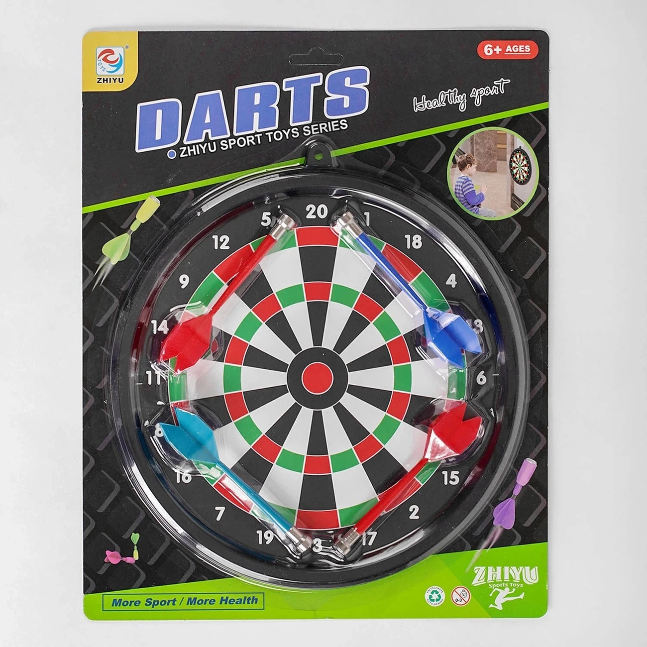 Дартс - це цікава спортивна гра з метання дротиків у круглу кольорову мішень, розділену на сектори з цифрами. Модель ZY 3009 є більш безпечною для дітей версією - з магнітною мішенню і дротиками з плоским наконечником. Завдання гравця - набрати найбільшу кількість очок, поцілюючи у середину мішені. Вона відмінно тренує влучність і твердість руки, дитина буде з цікавістю тренуватися, щоб навчитися потрапляти точно в ціль. Особливості: - відповідає технічному регламенту безпеки іграшок; - діаметр магнітної мішені - 25 см; - у комплекті йдуть 4 дротики з магнітним наконечником.