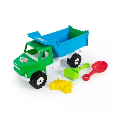 Машинка «Вантажівка Денні класик» з піщаним набором. Машинка пластикова з великими колесами. З відкидним кузовом, піднявши який можна висипати вантаж. Також, у наборі є: лопатка (25 см), граблі (20 см) та пасочка. Розмір 44*22*20 см. Вага 580 г.