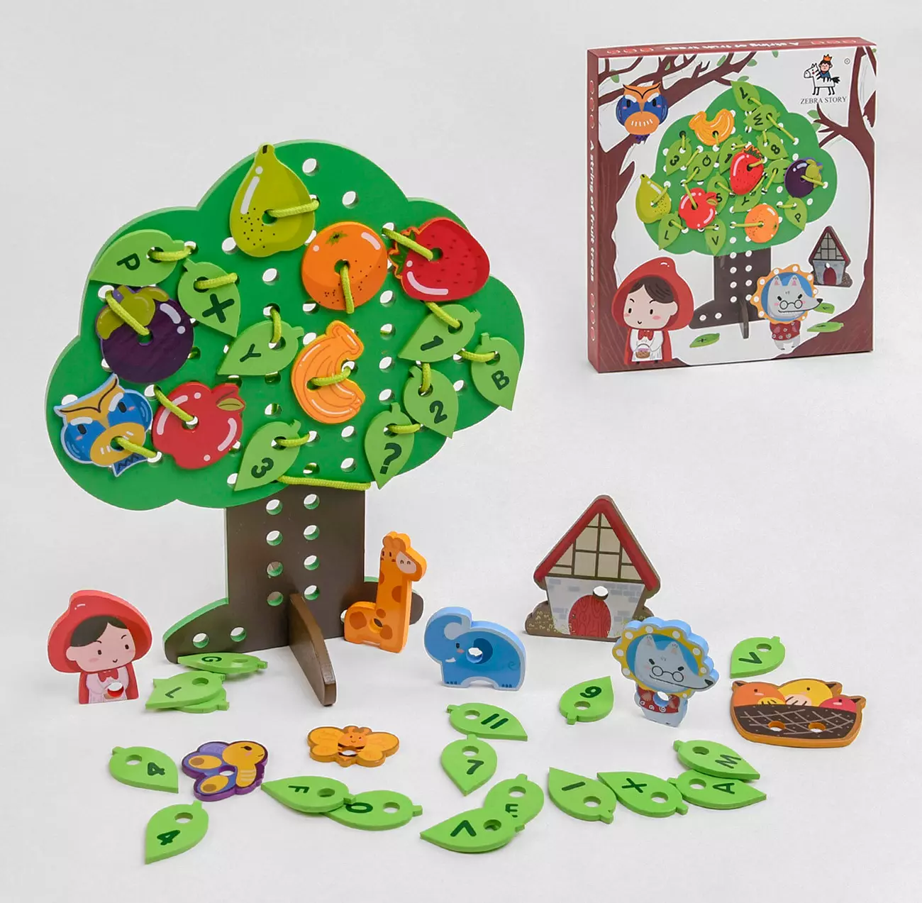 Дерев'яне шнурівка "Дерево" є ігровою поверхнею у вигляді дерева. Особливості моделі: - 3 способи гри; - оригінальний дизайн у яскравих кольорах; - якісні матеріали; - всебічний розвиток дитини від 3-х років. "Крона" дерева пронизана отворами для того, щоб дитина могла просмикнути туди шнурок. На шнурок можна надягати дерев'яні фрукти, які йдуть у наборі. Геймплей 1 Потоки: Гра із заправкою фруктів, вона дозволяє дитині носити фрукти та лист на фруктове дерево з мотузкою. Різні нитки літерних дерев вирвані, ланцюжки числових дерев, які можуть запитати у дитини назву кожного фрукта. Вправляйте дитину у розпізнаванні візерунків та кольорів. Геймплей 2 Сюжетна гра: Червона Шапочка та Бабуся Вовк. Звідки взялася Червона Шапочка, треба бігти в безпечне місце? Одягаючи казкових персонажів у потрібні місця, Червона Шапочка може вирватися з лап Вовка. На дереві живе безліч мислимих і несподіваних звірят, давайте разом вгадаємо, хто вони? Здатність дитини спостерігати і що можна сказати на думку, можна вправлятися, сцена-невелика розповідь! Геймплей 3 Дізнайся букву: На аркуші 26 літер. Подивимося, куди їм іти. Навчайте свого малюка по черзі букв, це може вивчити букви та прості словосполучення. Від нуля до дев'яти чисел можна порівняти, щоби просвітити ігровий процес. Граючи зі шнурком, малюк розвиватиме свої тактильні відчуття, тренуватиме логічне та просторове мислення, дрібну моторику рук. Деталі іграшки виготовлені з якісної деревини, пофарбовані в яскраві кольори та приємні на дотик. Розмір дерева – 22х13х24.5 см. Довжина шнурка – 96.5 см. Комплектація ігрового набору: - ігрова панель як дерева; - 6 фігурок тварин; - 6 фігурок фруктів; - 3 фігурки казки; - 26 двосторонніх листочків; - 2 шнурки; - інструкція.