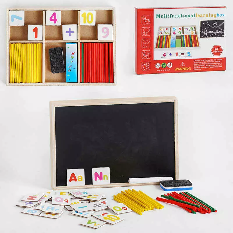 Дерев’яна іграшка Математика C 52559 (100) “Multifunctional learning box”, палички, цифри, знаки, дошка для малювання крейдою, у коробці