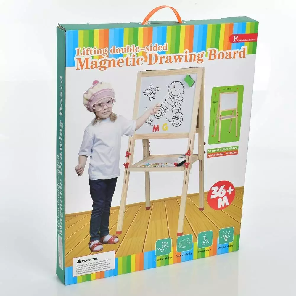 Дерев'яна іграшка Мольберт MD 1959 (8шт)двосторонній 39-32 см,маркер,крейда, ганчірочка, в кор-ці,60-48-5,5см
