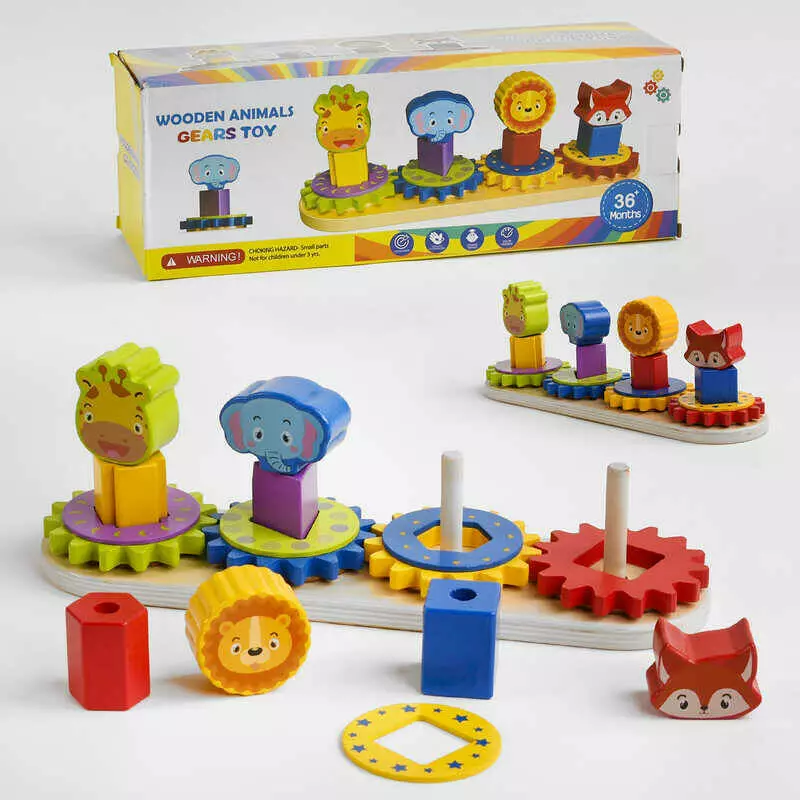 Дерев'яна логічна гра С 49840 (24) Геометрична пірамідка сортер з шестернями, що обертаються, платформа з кілочками, 12 деталей, в коробці