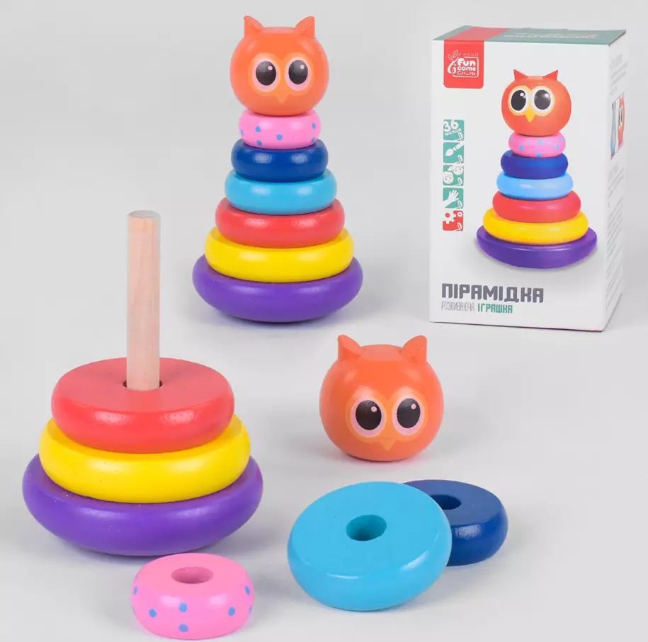 Дерев'яна пірамідка 91552 (24) "Fun Game", "Сова", неваляшка, 5 кілець, в коробці