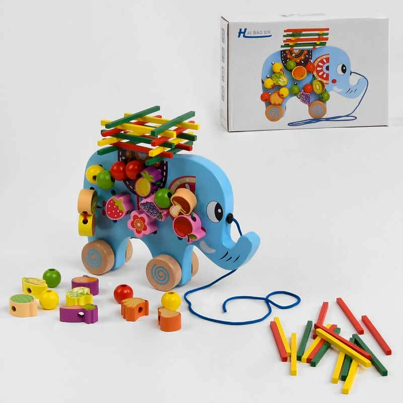 Дерев'яна каталка C 48174 (36) ""Слоненя"", шнурівка, брусочки, в коробці