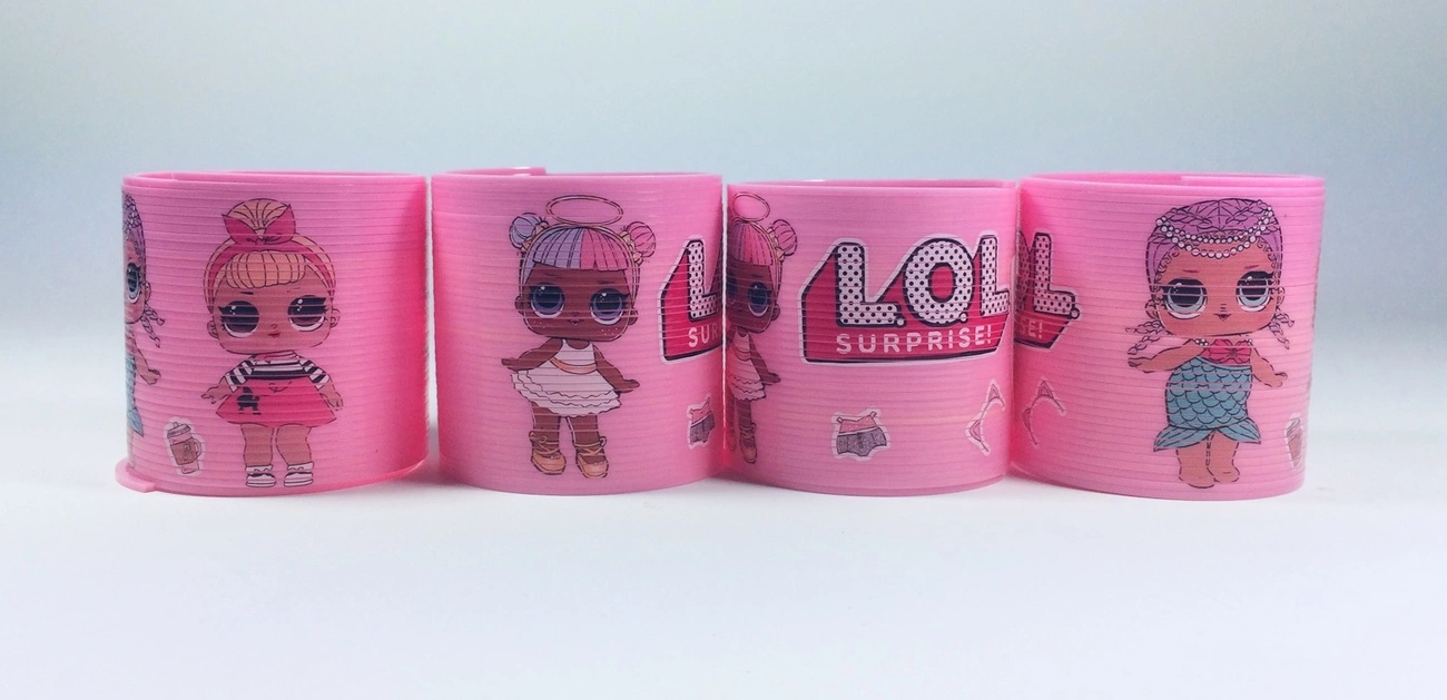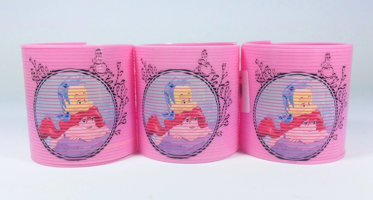 Дитячі веселки зроблені у вигляді пружинки з рожевого пластику з зображенням якогось казкового персонажа. Діаметр веселки становить 7 см, а довжина 7 см.
