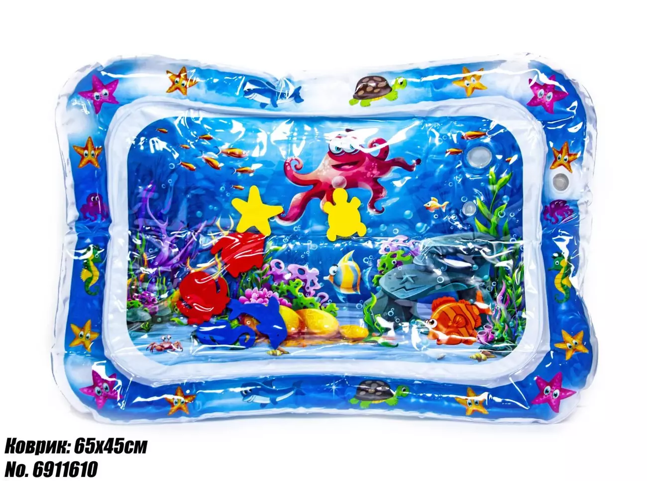Килимок яскравий, цікавий і постійно хитається. Також у ньому плавають різні фігурки кольорових рибок. Просто потрібно заповнити його водою, поставити на рівну поверхню і покласти немовля животиком донизу. Така гра викликає масу позитивних емоцій як у дитини, так і її батьків! Коли малюк лежить на животі, це стимулює розвиток м'язів шиї та плечей, зміцнює спину, ніжки та ручки. Водяний килимок з рибками буде чудовою розвагою для Вашого малюка. Малюкові буде цікаво лежати на ньому на животику. Характеристики: Матеріал: ПВХ Розміри: 65х48 см Розмір у складеному вигляді: 20х20 см Вага: 200 г Упаковка: поліетиленова, м'яка