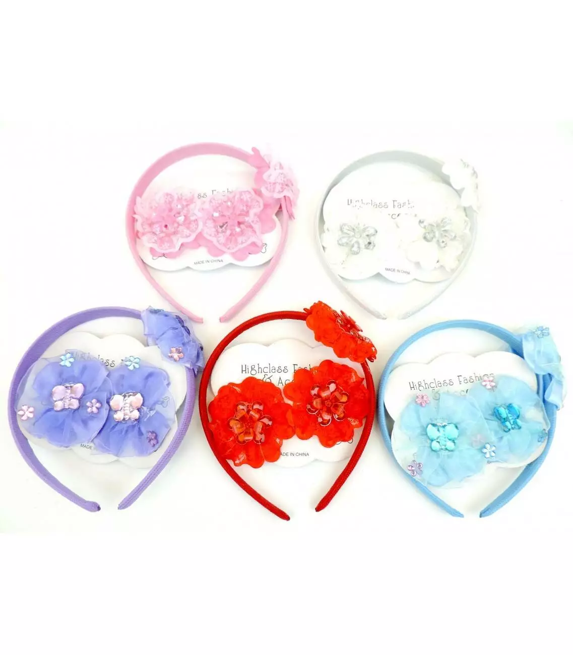 Набори біжутерії для дітей складаються з планшетки, на якій закріплено 6 гумок і 4 шпильки, і чотири маленьких крабів для волосся рожевого кольору. Обруч прикрашений великим чотирикрилим метеликом в діаметрі 12 . В усіх дитячих прикрасах використано закруглені краї і безпечний пластик.