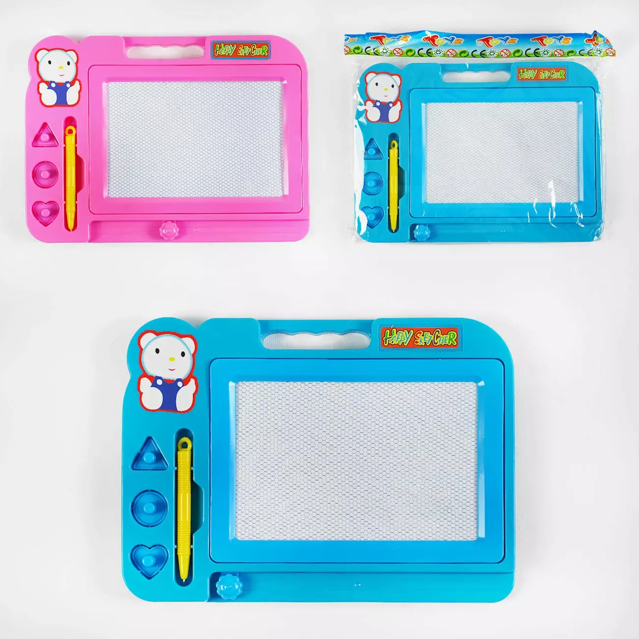 Яскрава дошка для малювання зі штампами стане помічником та основним інструментом у створенні перших креативних шедеврів малюка. Адже вона проста у використанні, бо принцип малювання досить легкий — достатньо провести спеціальним олівчиком, який на кінці має маленький магнітик, що дозволить створити малюнок, на білій до цього дошці. А милий ведмедик спостерігатиме за першими шедеврами, які побачить ця дошка, тож сміливо бери олівець та тренуй свою креативність. Особливості: - яскравий колір дошки; - до дошки, окрім спеціального олівця, додаються 3 штампи; - дошку прикрашає наліпка милого ведмедика; - іграшка виготовлена з якісного пластику, який є безпечним для здоров’я дитини.
