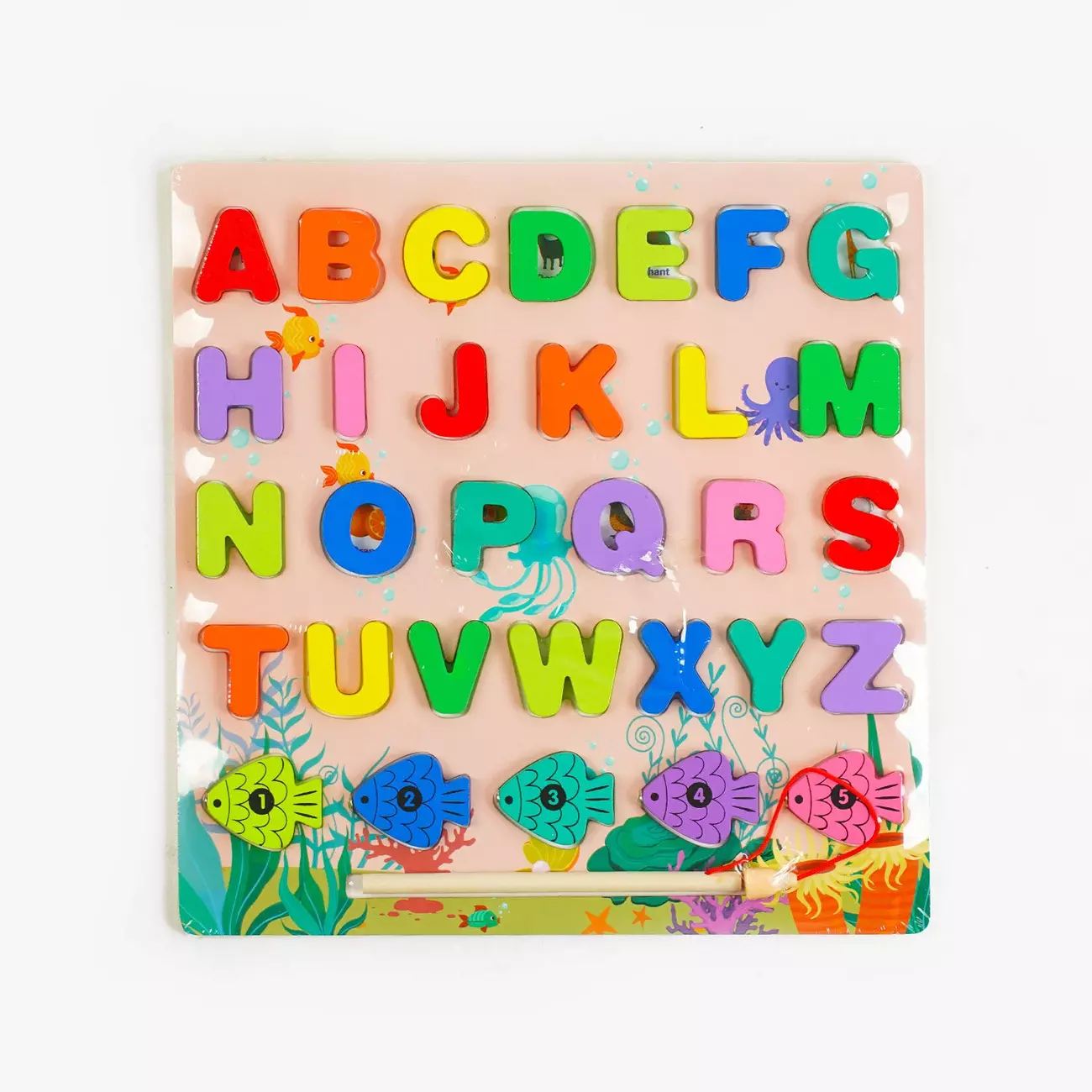 Знайомимося з літерами англійського алфавіту або вчимося рахувати у процесі веселої розвивальної гри! Ігрове поле містить поглиблення з силуетами літер або цифр. Завдання дитини - правильно підібрати елемент і розмістити його у відповідному поглибленні. Можна ускладнити завдання, запропонувавши малечі відтворити правильну послідовність літер алфавіту або числового ряду поза межами ігрового поля. Додатковою цікавою розвагою стане магнітна риболовля, яка навчить маленьких рибалок рахувати від 1 до 5, виловлюючи з уявної водойми пронумерованих рибок. Особливості: - розмір дошки: 29х1х29 см; - дерев’яний пазл-вкладиш; - магнітна риболовля; - рибки позначені цифрами від 1 до 5; - якісне фарбування нетоксичною фарбою; - іграшка виготовлена з екологічно чистих та безпечних для здоров’я дитини матеріалів.