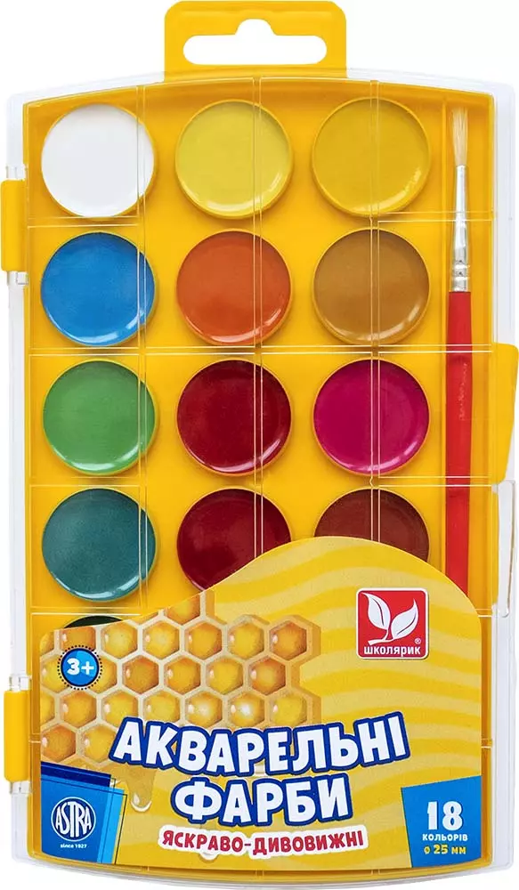 Додайте лише трішечки води і акварельні фарби допоможуть створити справжній шедевр! І не бійтеся експериментувати, адже кольори легко змішуються, а текстура дозволяє поєднувати інші види продукції під час творчості. Фарби наявні у наборах з 12, 18, 24, 32 кольорів та є на 98% натуральними. Для дітей від 3-х років. Особливості фарб: Рівномірне покриття Насичені та яскраві кольори Кольори гарно змішуються між собою, утворюючи різні відтінки Матовий ефект після висихання Стійкі до світла