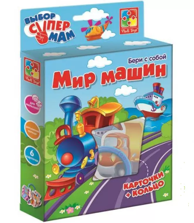 У наборі пластикове кільце, на яке дитина зможе збирати 6 двосторонніх фігурних карток або знімати їх. Фігурні картки розкривають дві теми: назва транспорту і хто ними керує (ракета - космонавт; паровоз - машиніст і тд.). Сприяє розвитку уваги, логіки, мислення і пам'яті.