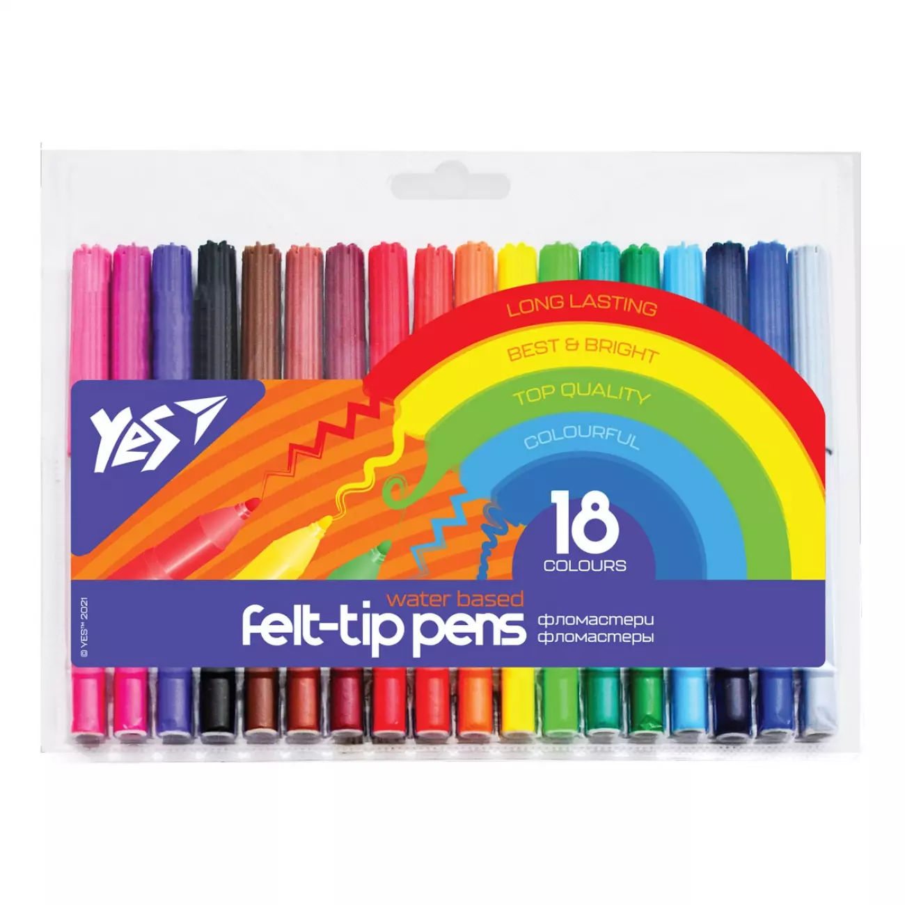 Фломастери торгової марки YES призначені для малювання в дитячому садку, школі чи вдома. Даний набір складений з вісімнадцяти яскравих кольорів. Він чудово впорається з реалізацією найсміливішої дитячої фантазії. Переваги фломастерів YES: - Безпечні чорнила на водній основі - Відмінно змиваються холодною водою - Міцний поліпропиленовий корпус стійкий до усіх видів механічних навантажень - Ковпачок с вентиляційними отворами - Стійкий до вдавлювання пишучий вузол - Яскрава прозора упаковка, зручна для зберігання і транспортування