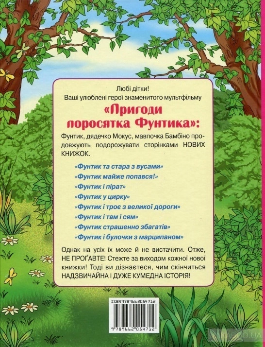 Автор:Валерій Шульжик Видавництво:Сім кольорів Серія книг:Пригоди поросятка Фунтика Мова:Українська Перекладач:Надія Кир'ян Вік:3+ Ілюстратор:Вікторія Дунаєва Кількість сторінок:64 Ілюстрації:Кольорові Формат:84х108/16 (~205х265 мм) Палітурка:Тверда Папір:Офсетний ISBN:978-966-2054-71-2 Вага:350 гр. Тип:Паперова Казка про поросятко Фунтика, якому стало соромно обманювати дітей і він втік від пані Беладонни, своєї хазяйки. У лісі він зустрів доброго фокусника Мокуса, який запросив Фунтика до свого цирку. Пригоди поросяти продовжуються...