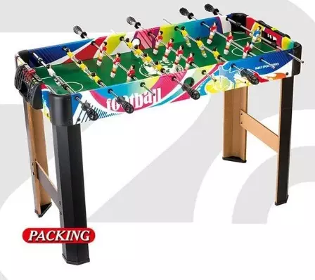 Дерев'яний футбол підлоговий 1084 виготовлений з екологічно чистого матеріалу, доповнений пластиковими та металевими елементами. Ігрове полотно є зменшеною копією реально існуючого футбольного поля, на якому відбуватимуться світові матчі. Матова темно-зелена основа розкреслена під лінію розлучення м'яча, штрафну зону та воротарську площу з пластиковими воротами, а також вбудованими фіксованими таблицями для зручного ведення рахунку. Правила гри дуже прості і нічим не відрізняються від звичайного футболу: необхідно забити якнайбільше голів у ворота суперника, але при цьому не забувати про захист свого боку. У футбольному матчі беруть участь дві сильні команди: червоні та жовті. У кожній команді 11 гравців (10 польових та 1 воротар). Керувати фігурками необхідно за допомогою спеціальних телескопічних рукояток, на яких розміщено певну кількість гравців. Осі напрямних виконані з металу, а знімні ручки-тримачі із пластику з антиковзним рельєфом. Крім того, стіл оснащений рахунковим табло, де Ви зможете з легкістю фіксувати результат, не відволікаючись від ігрового процесу. Особливості моделі: - каркас із високоякісного ДСП; - металеві штанги; - рахункове табло та 2 м'ячі. Комплектація: - Каркасні елементи; - ігрове поле; - 8 металевих штанг; - елементи кріплення з фігурками гравців; - 2 пластикові м'ячі; - 2 циферблати; - Пластикові ручки з антиковзким покриттям.