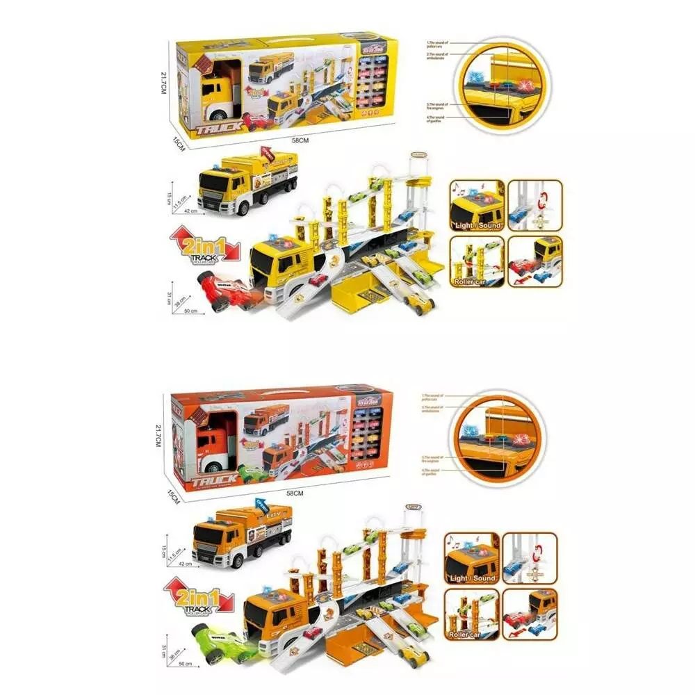 Гараж 660-S19-20 трейлер-інерц., гараж/трек, машинки 8шт., 2 види,муз.,світло,бат.,кор.,58,5-22-15см