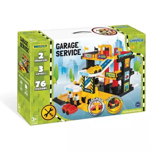 Гараж Сервіс – це ідеальна іграшка для маленьких автолюбителів. Сучасний, реалістичний гараж обладнаний ліфтом, що перевозить машинку на потрібний поверх, рампою, авто мийкою, автозаправкою, станцією техобслуговування, 2 машинками і багатьма декораціями і наклейками. Набір дозволяє придумувати багато сценаріїв ігор, розвиває уяву дітей і спонукає до креативності. Ігри набором покращують руховий розвиток наймолодших, особливо дрібної моторики, їх мануальні здібності, точність рухів і зорово-моторну координацію, навчають логічного мислення і просторової орієнтації. Різнокольорові елементи сприяють вивченню основних кольорів. Під час гри дитина знайомиться з принципами дорожнього руху, а також вчиться як безпечно переходити дорогу. Всі елементи виготовлені з високоякісного безпечного і міцного матеріалу, завдяки чому всі частини траси зберігатимуть вигляд і колір протягом багатьох років. Набір упакований в гарну коробку, ідеальну на подарунок. Набір можна поєднувати з транспортними засобами з серії Kid Cars 3D, Kid Cars, Kid Cars Sport. Гараж Сервіс: складається з різнокольорових, легких у кріпленні елементів, з яких можна скласти 3-поверховий гараж містить ліфт, рампу, авто мийку, автозаправку, станцію техобслуговування, 2 машинки і багато декорацій і наклейок проста у складанні конструкція дає можливість придумувати різні сценаріїв ігор виготовлений з високоякісного, безпечного і міцного матеріалу упакований в гарну коробку, ідеальну на подарунок для дітей від 3 років