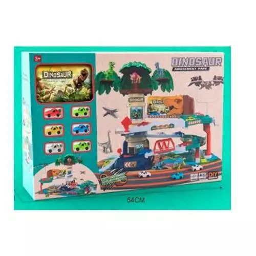 Гараж XZ-1068 2 поверхи, динозаври, машинки 6 шт., муз., бат., кор., 54-37-11 см.