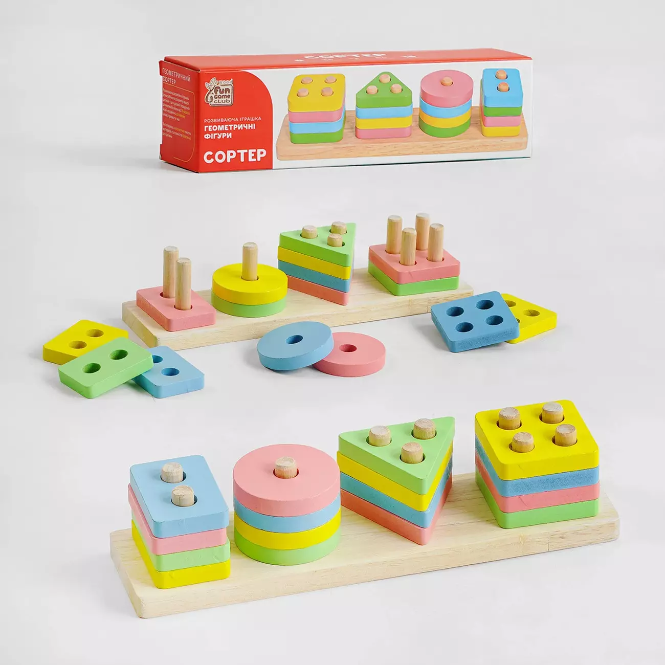 Подорожуйте чарівними стежками знань разом з нашою розвивальною іграшкою “Геометричний сортер” від українського виробника “4FUN Game Club Wood”, яка допоможе вашій дитині досліджувати наш дивовижний світ, відкривати нові знання і розвивати корисні вміння. Логічна гра стане чудовим подарунком для дітей віком від 18 місяців, який неодмінно прийдеться до вподоби карапузам. Під час гри Ваш малюк познайомиться з різними кольорами, азами арифметики та геометричними формами. Кожна хвилина гри з “Геометричним сортером” стане захопливим уроком, який допоможе розкрити потенціал вашого малюка. Особливості: - стильний барвистий дизайн; - приємне кольорове поєднання; - 4в1: пірамідка коло, пірамідка-прямокутник, пірамідка-трикутник; пірамідка-квадрат; - кожна пірамідка складається з 4 елементів; - допомагає розвитку дрібної моторики, логічного мислення, координації, слуху, посидючості та уважності; - іграшка виконана з екологічно чистих матеріалів та є повністю безпечними для дітей.